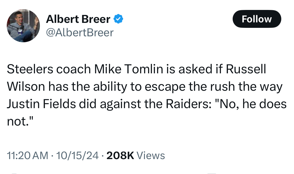 Guess Mike Tomlin is too. Never ever hear anybody say shit about how good Fields is passing the ball. It’s ALWAYS his legs and running ability.