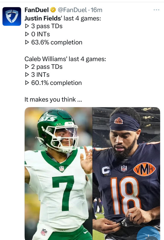 And my point isn’t that Fields is playing great, he’s not. He’s been really bad at times this year; but the line between perception and reality is razor thin at times. Particularly when discussing NFL quarterbacking.