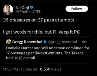 PAMan said the defense was “suspect” last night. They held arguably the best offense in the league to one TD and four super long FGs. The only guy to meet his yardage projection was Collins (this includes Stroud). And they did this on the road. The defense was good. The offense on the other hand…