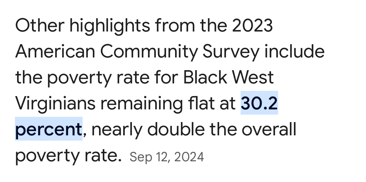 Not that poverty rate has a lot to do with “privledge,” but clearly being black doesn’t pay in W. Virginia. Widely regarded as the nation’s most racist state btw.