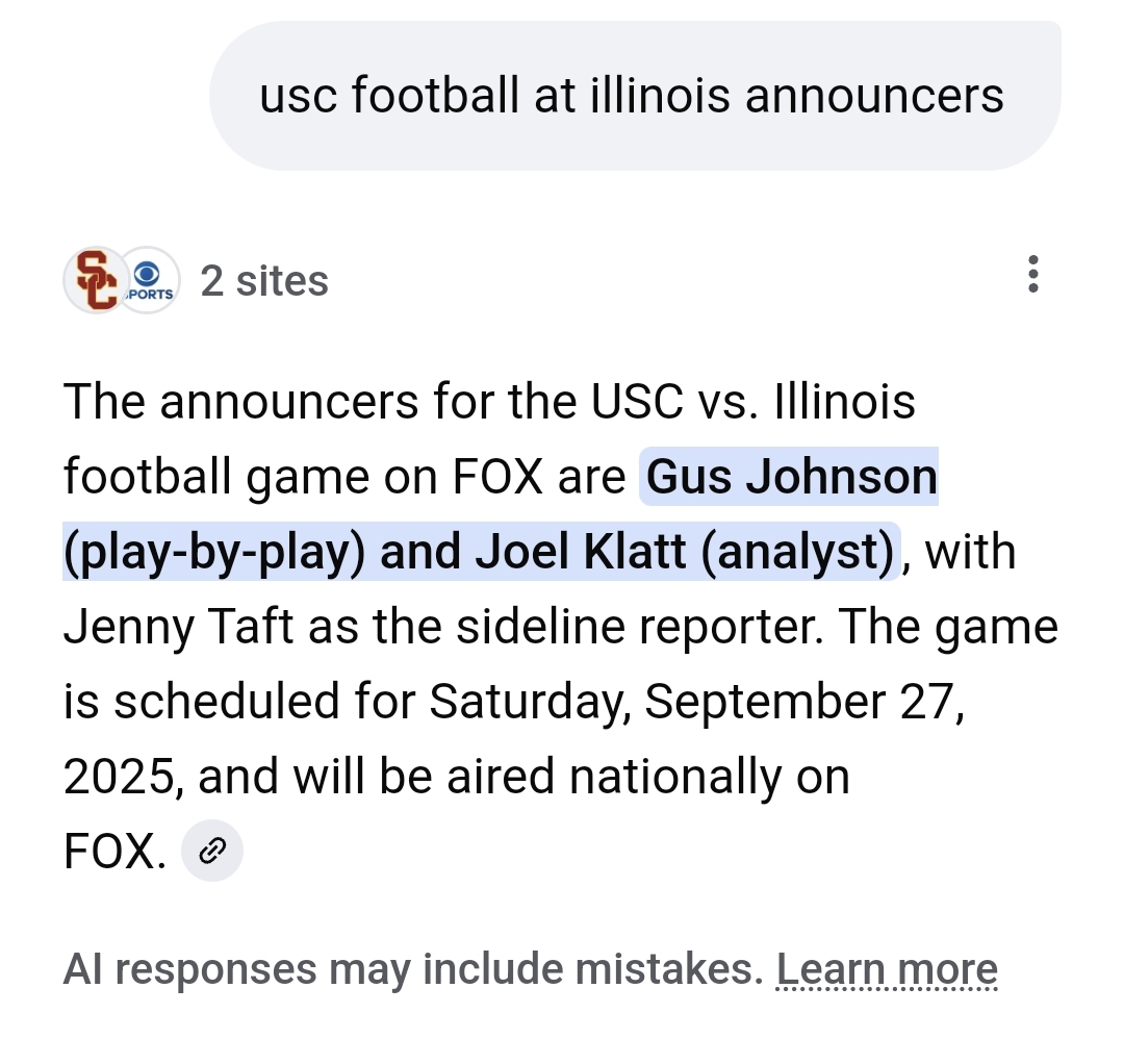 Last night  I was looking for the announcers that we will be blessed with today. This AI said the game was Sept 28, 2024.