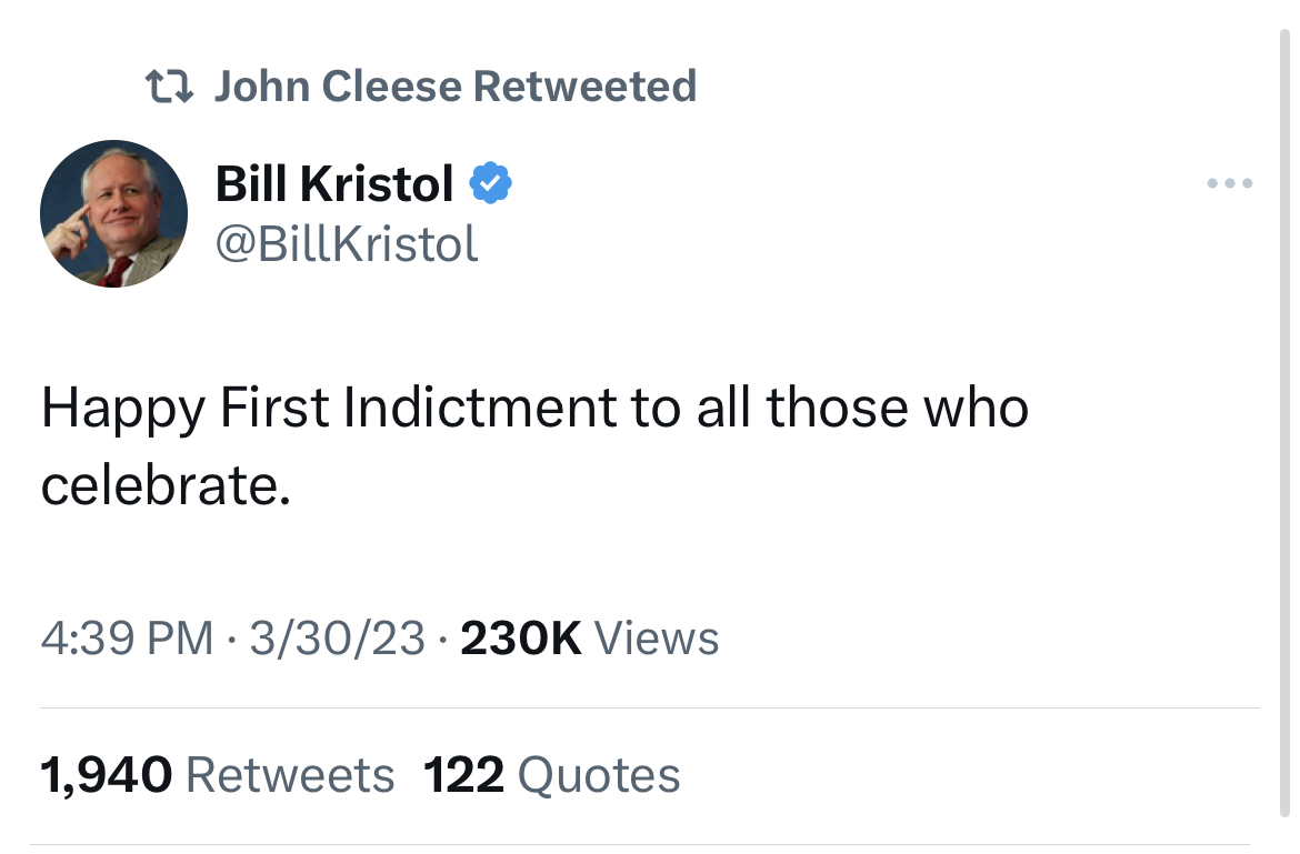 I don’t retweet Bill Kristol very often but when I do it’s a funny post about Trump being indicted.