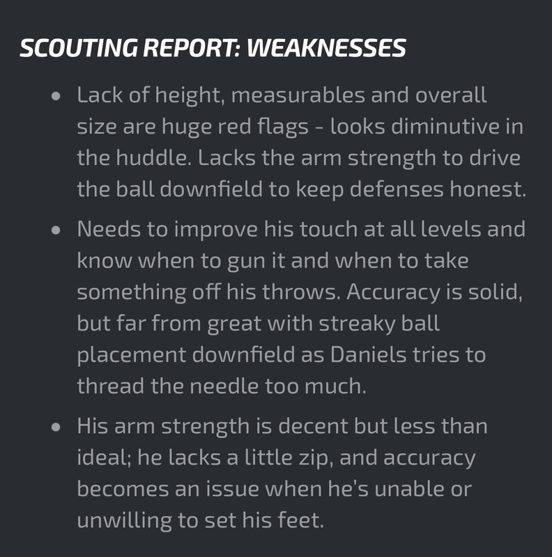 So you want to dump Justin Fields for a 6’0 quarterback who’s started 17 games over 3 years and gone 6-11? Best season by far was for 1,400 yards passing?