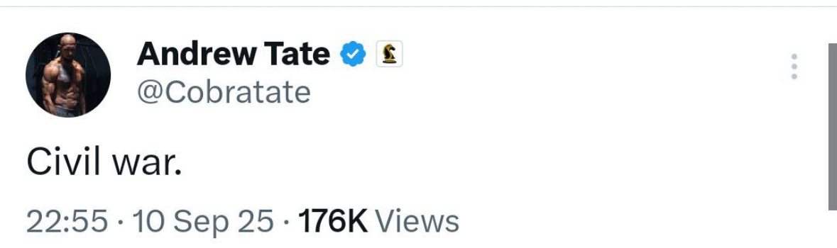 I think it's more telling that you think that Charlie Kirk being shot will "galvanize a revolution", while people who are Democrats never said that about the assassination of the Democratic Speaker of the Minnesota Assembly, or Gabby Giffords, or the hammer assault on the husband of the Democratic Speaker of the House. Are you saying that the people who follow Charlie Kirk are more prone to being activated to violence than random liberals?