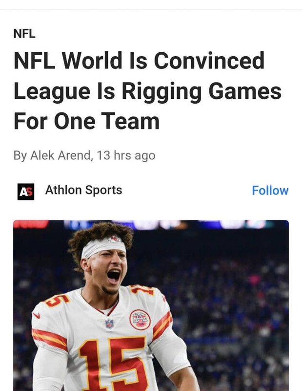 The NFL has informed the referees to somehow let the Chiefs win every week. Such bullshit! I’ve never seen such blatant favoritism…